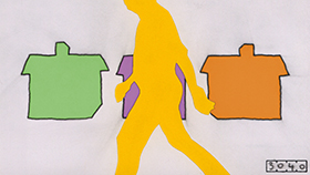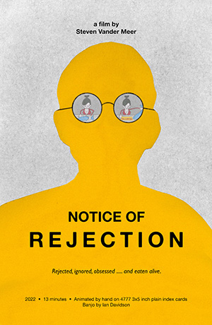 There are two main characters in the film; I consider the "Notice of Rejection" itself to be an antagonist, while the protagonist happens to look a lot like me. The Notice is made of yellow paper which is physically cut out and glued onto each drawing. I did it this way to give the character a life and a style of it's own. This turned out to be a lot of extra work and a little bit messy with the glue, so I'm not sure it's a technique I'll be using again soon. I used a home-made rotoscope device with video footage of myself to get the main character's movements. Integrating the rotoscope animation with the imaginary stuff was a particular challenge.