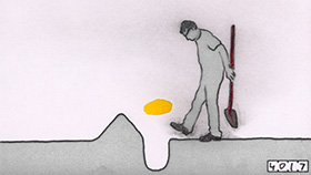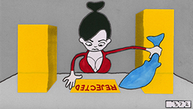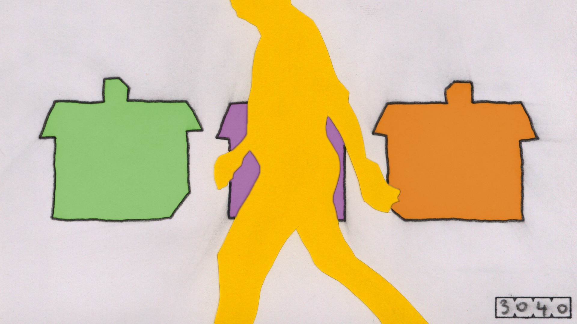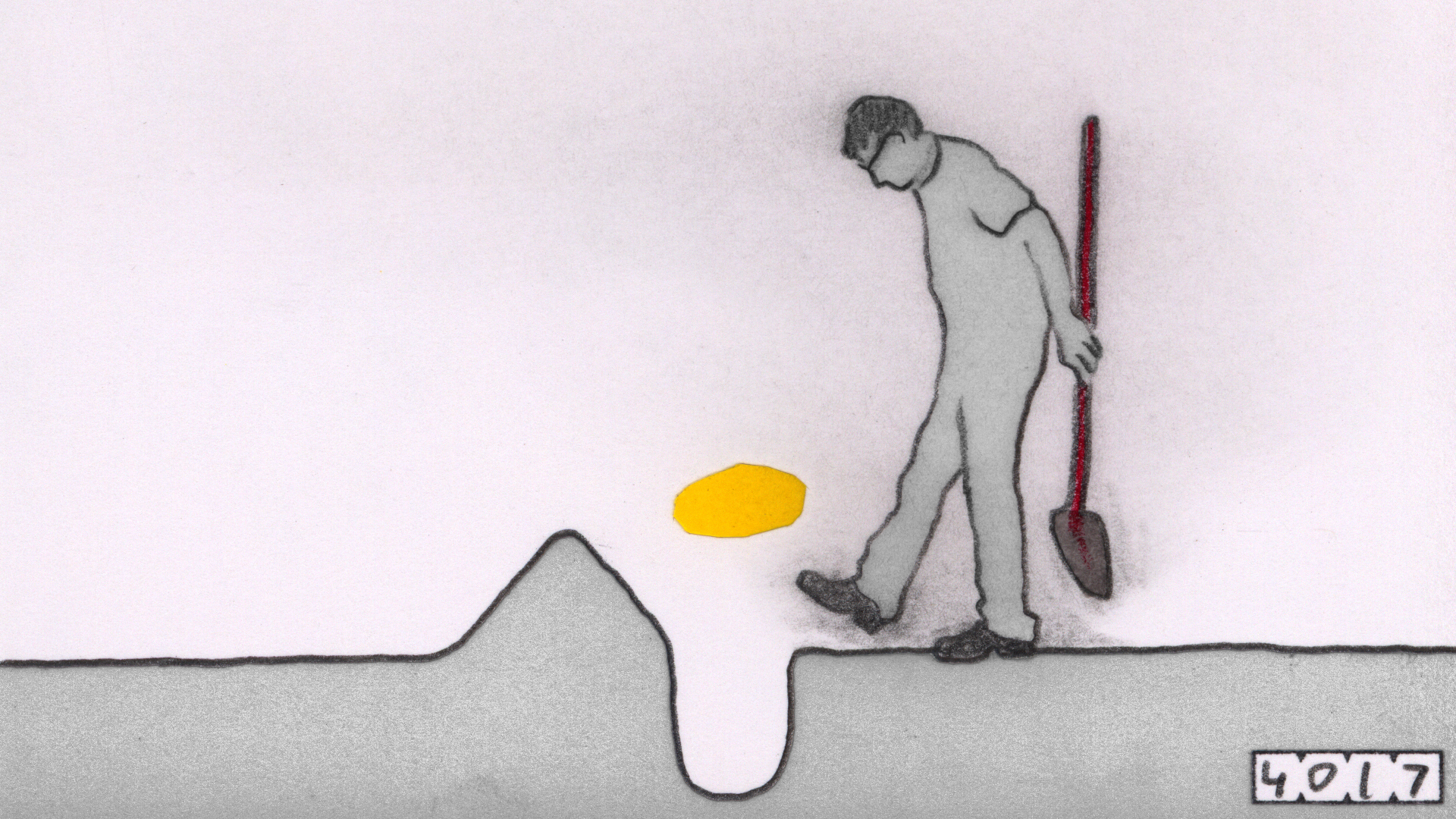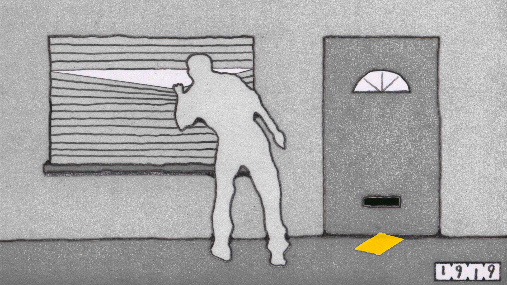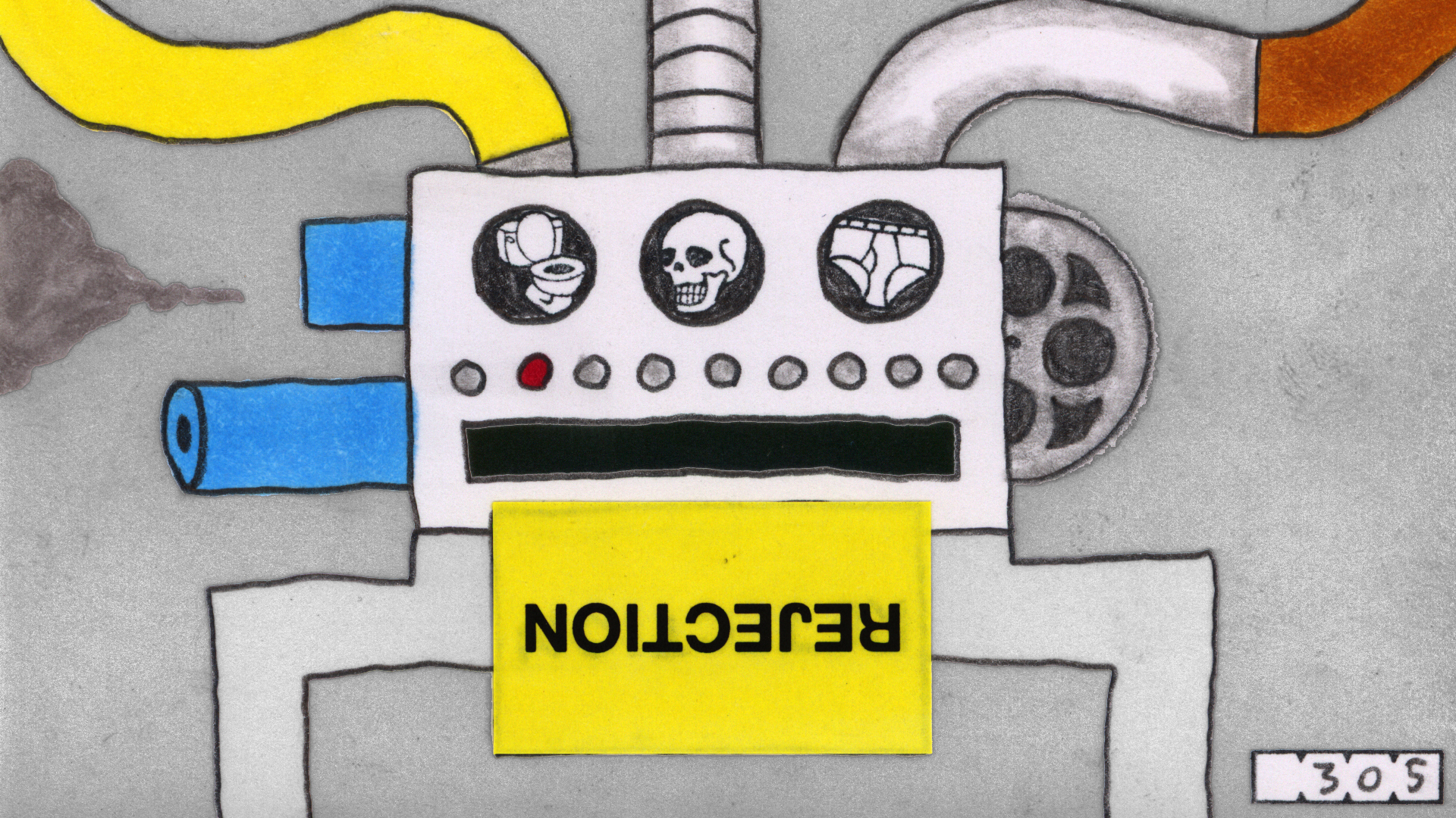 Dirt. A lot of it got into this film, and I left it there on purpose. I began animating before computers were a thing, back then we used real film. In actual film editing everything has to be kept very clean, and I felt the same way about my little drawings, so I took good care of them. Over the years as computer animation gradually became mainstream, I subconsciously tried to keep up appearances by "cleaning" my drawings after they were scanned - a tedious process in Photoshop. In Notice of Rejection, however, I have embraced the fact that these little drawings get dirty with graphite dust, eraser crumbs, fingerprints, glue and other tiny bits of detritus. I purposely used soft pencil, not ink, for lines, and then smudged and smeared it further. I feel that the more "hands-on" my work looks, the better. In some cases, such as when a piece of dirt got stuck to the scanner and appeared static in the film, I would digitally erase that because I felt it was distracting. It goes against my nature to be messy, but I hope to have struck a balance in this film between orderliness and dirt.