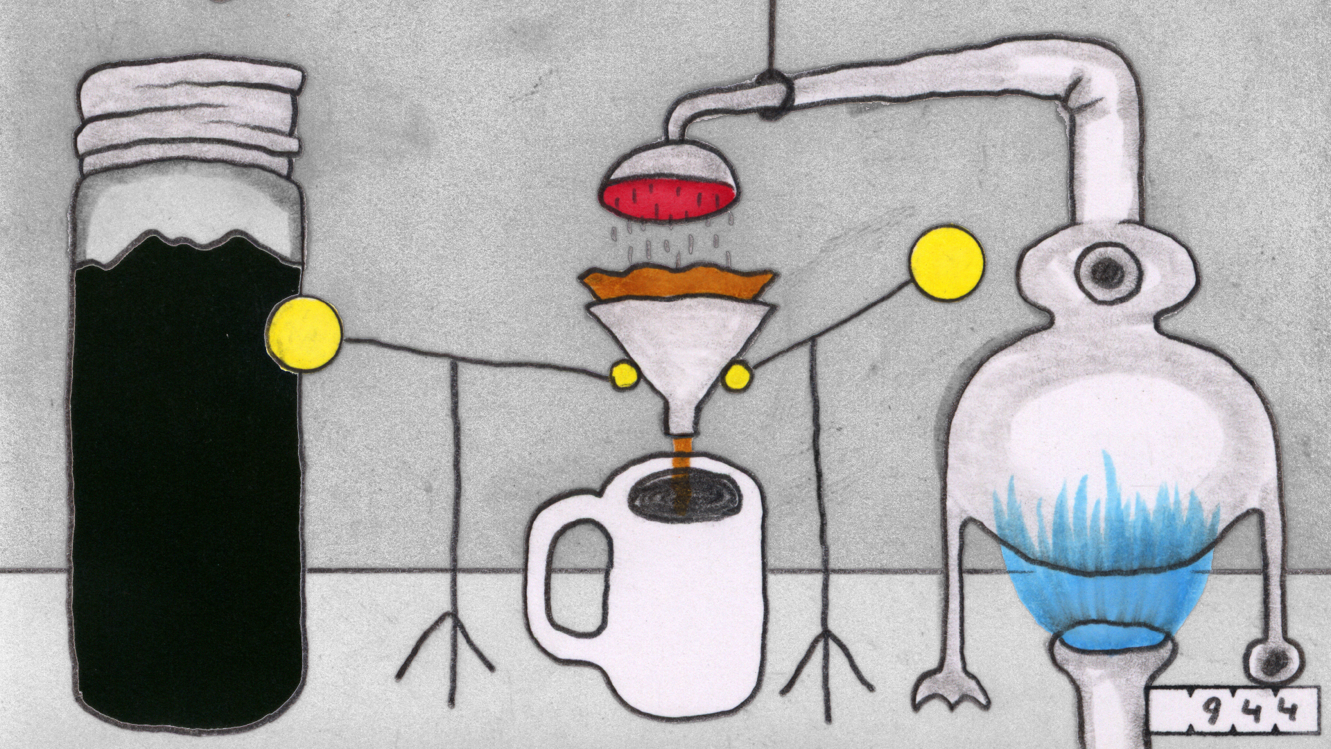 Along with the "odometer" in this film there is an audio accompaniment, sounding as if the viewer were thumbing through a very large flip-book. It's a constant reminder that you are looking at a series of small, non-moving images, all on a single layer. There are no static backgrounds, every element on every frame, of which there are 12 per second, had to be drawn by hand each time. I don't do it this way so I can brag about the amount of work that went into a film, it's the way of working that makes the film. In those hours of animating, decisions are constantly being made, and those choices decide how the film will ultimately turn out. I do follow a rough story board, but it changes as I go, and the details are filled in on the fly.